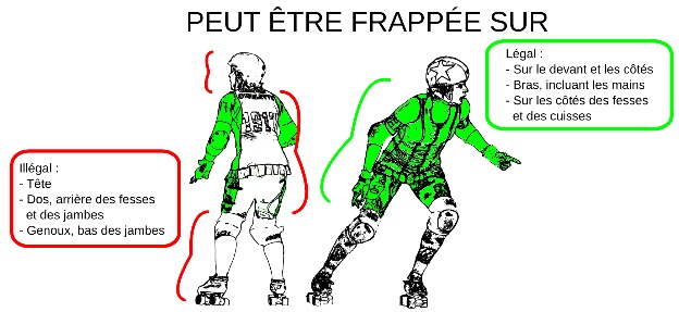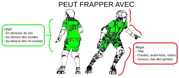 Nota Bene : On ne peut pas frapper quelqu’un dans le dos, ni utiliser ses mains ou ses avant-bras pour pousser ses adversaires, empêcher les joueuses de passer en s’agrippant à ses coéquipières, ou rentrer dans d’autres joueuses lorsqu’on patine dans la mauvaise direction sur la piste